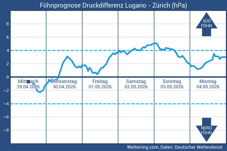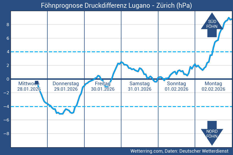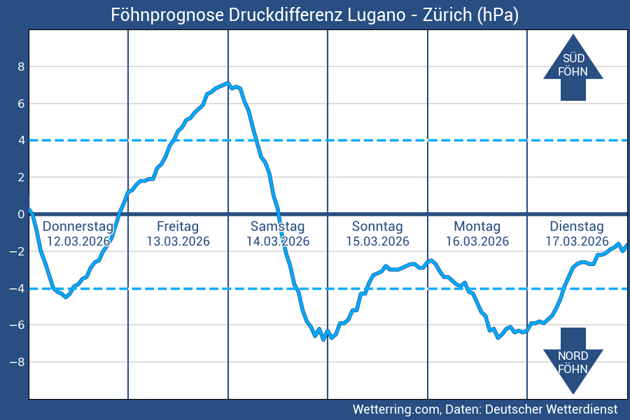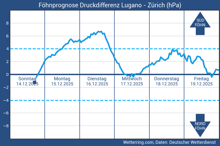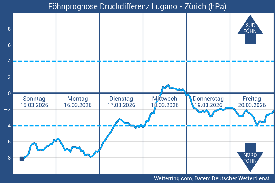 Im Föhndiagramm wird die Luftdruck-Differenz zwischen Lugano und Zürich dargestellt. Herrscht in Lugano höherer Luftdruck als in Zürich vor, wird von einem Südüberdruck gesprochen.