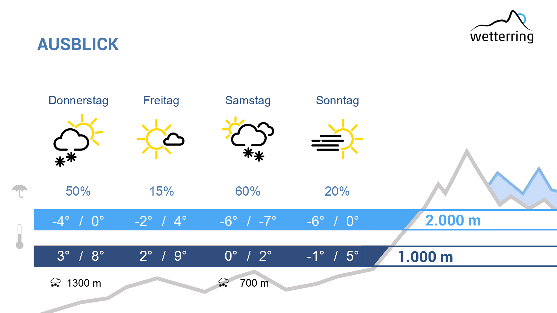 Der Donnerstag startet bewölkt mit ein paar Regentropfen (oberhalb von 1200-1400 m Schneeflocken). Ab Mittag immer mehr sonnige Abschnitte. Mit dem Sonnenschein bis zu 13 Grad im Rheintal und um 0 Grad auf 2000 m Höhe.