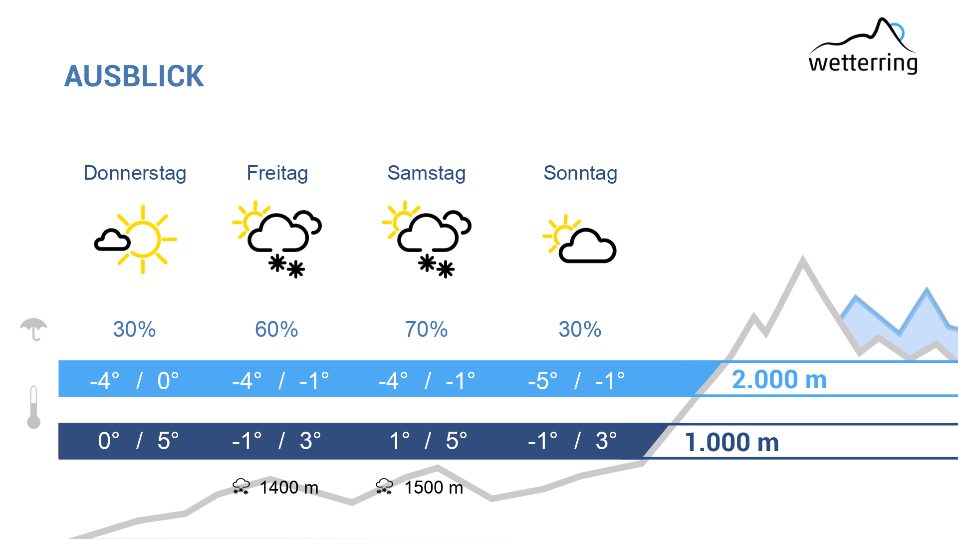 Am Freitag erneut kurz föhnig, ehe eine Front etwas Niederschlag bringt bei einer Schneefallgrenze von ca. 1400m. Es bleibt aber in allen Höhenlagen zu mild für die Jahreszeit.
