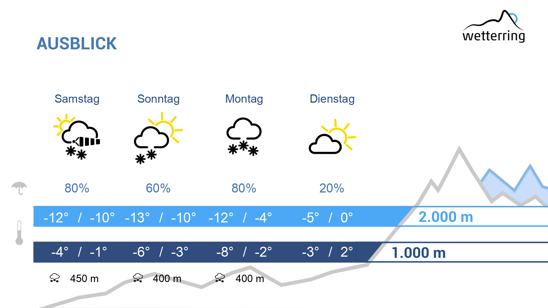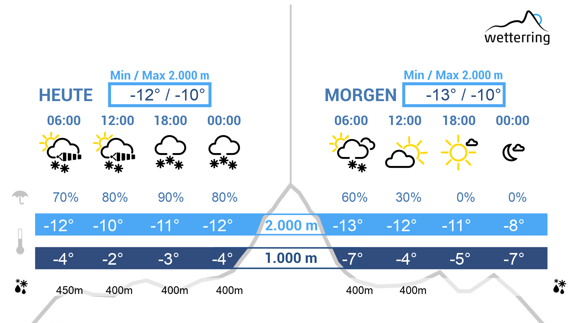 Nach einem eisig-kaltem Tagesstart deutet sich in der neuen Woche deutet bereits die nächste Warmfront an. Damit fällt auch wieder Neuschnee bis in tiefe Lagen. Erst in der Nacht auf Dienstag dürfte es in Regen übergehen. In der Höhe wieder starker Westwind.