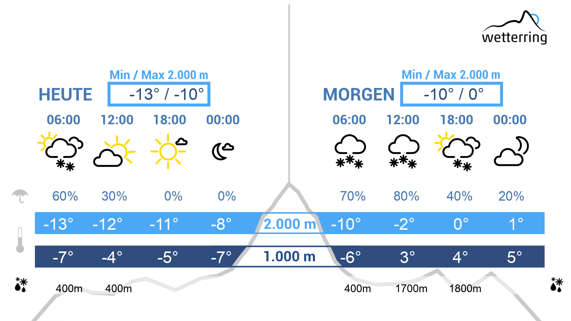 Der Montag startet eiskalt aber bereits bewölkt mit ersten Schneeschauern. Untertags drückt dann eine Warmfront herein. Damit gibt es etwas Schneefall der aber bald in Regen übergeht. In der Höhe weht stürmischer Westwind.